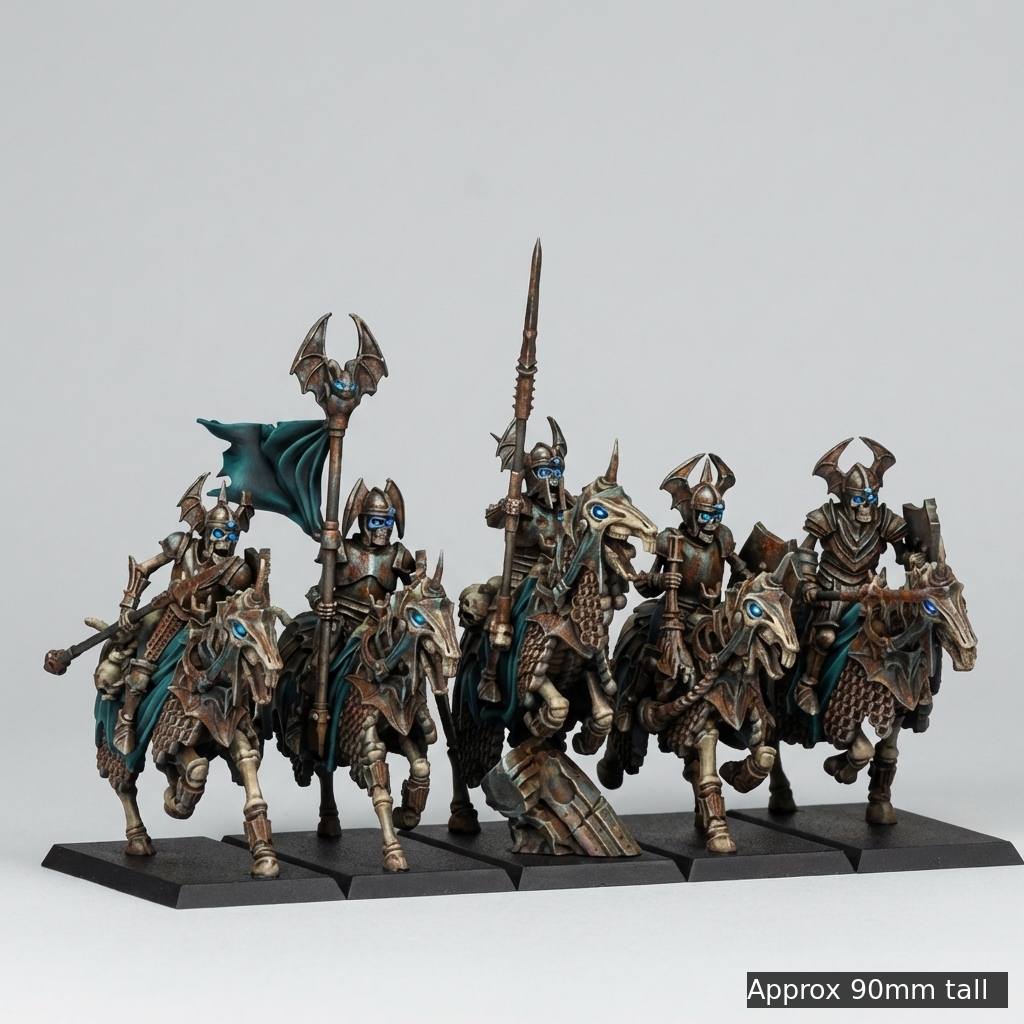 Five mounted models, each a two-piece kit (rider and horse). Knights raised from ancient burial mounds, still armoured for war and bound to serve the lords of the undead. Once the elite cavalry of a forgotten kingdom, they now ride as the shock force of any undead host, unleashed to break flanks and run down fleeing enemies. The dead do not tire. Sculpted by Crab Miniatures as part of their Vampire Army range. Suited to undead armies, rank fantasy wargames, and dioramas.