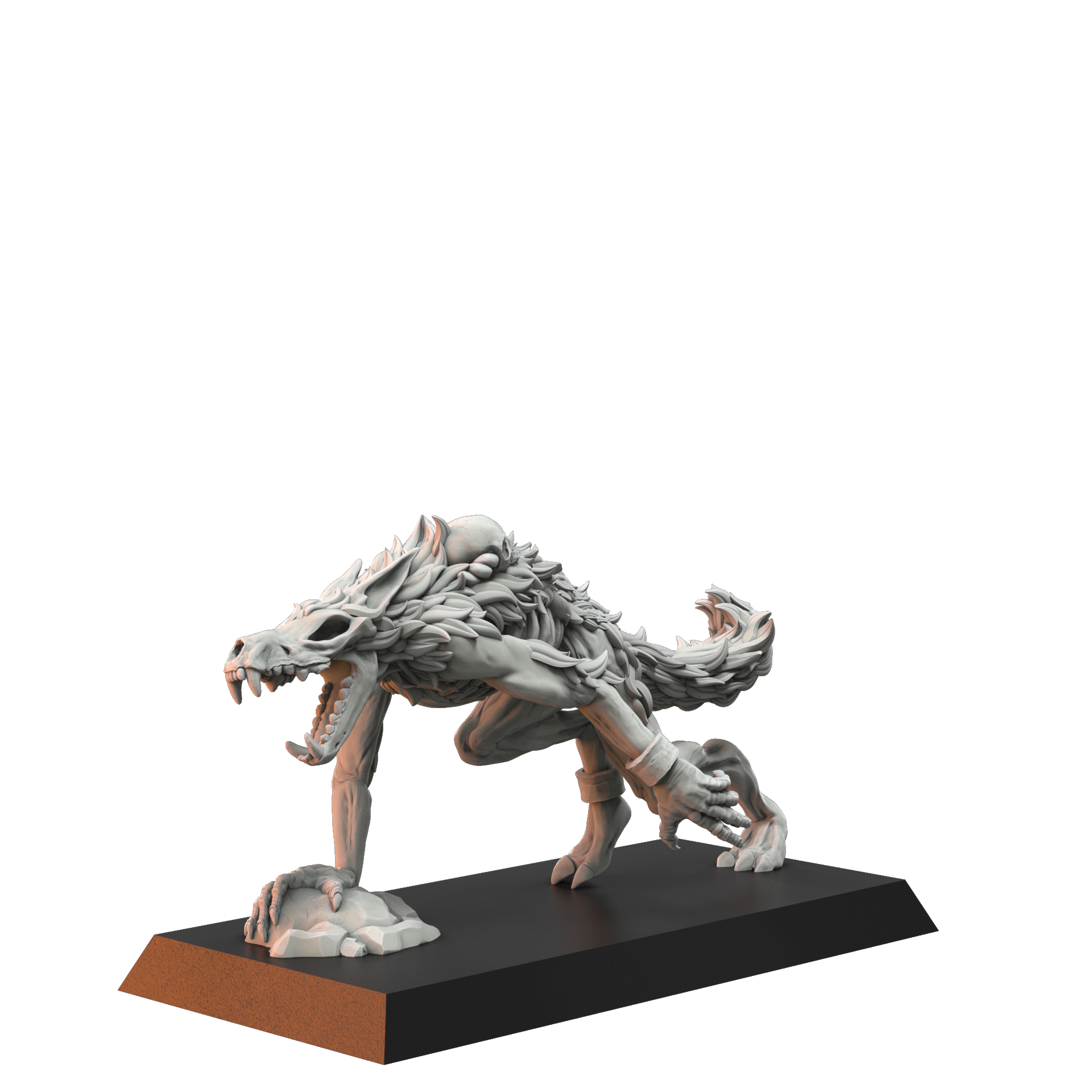 Dire Wolves is a set of 5 savage undead wolves and a rocky scenic element, from the Vampire Army range by Crab Miniatures. Printed in high-quality resin on professional-grade printers. Ships unpainted and unassembled, ready for painting and basing.