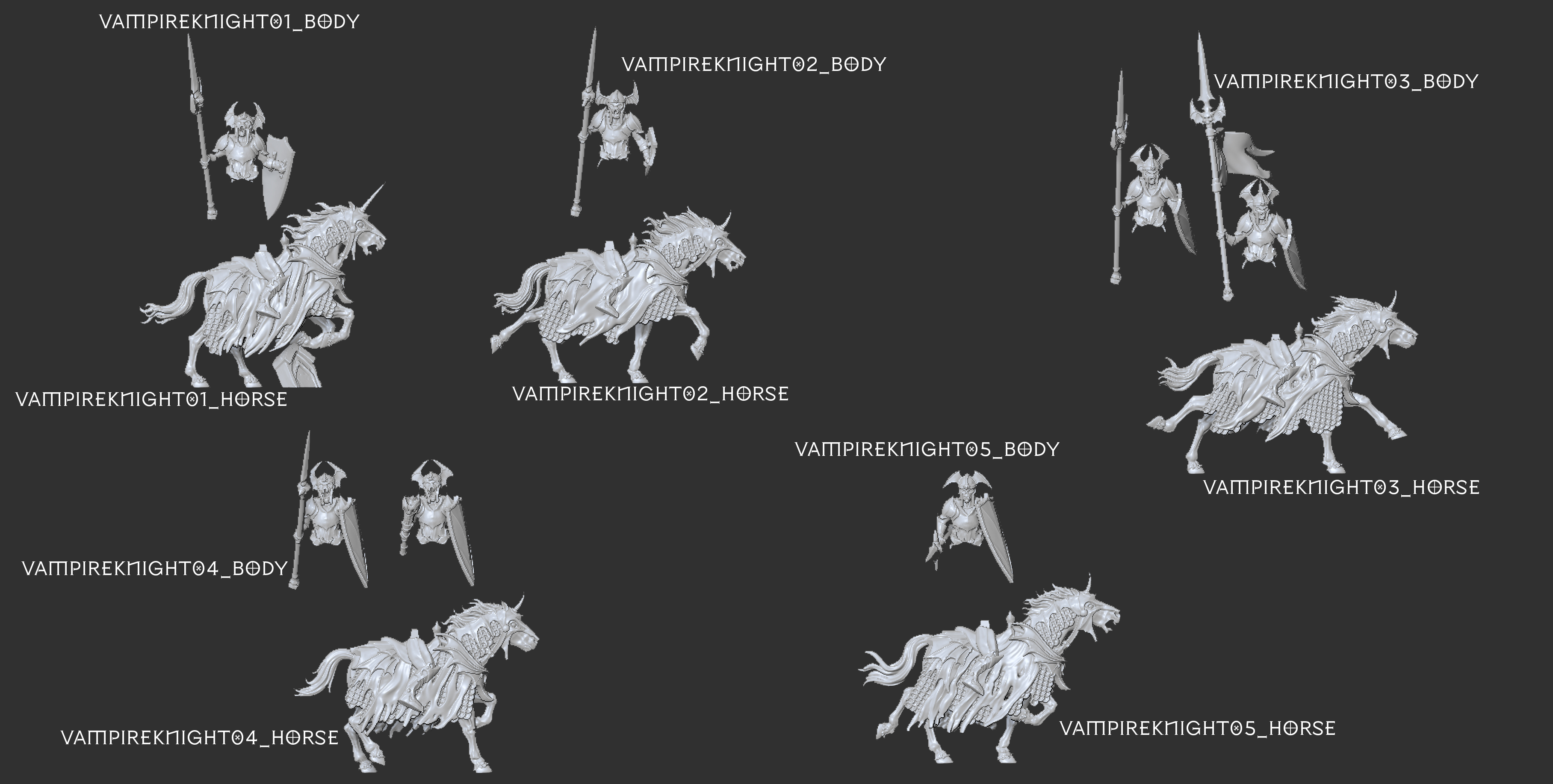 Five Vampire Knights on undead warhorses, the elite armoured cavalry of Crab Miniatures' Vampire Army. Printed in high detail resin, these gothic grimdark riders are fully paint-ready straight from the package.