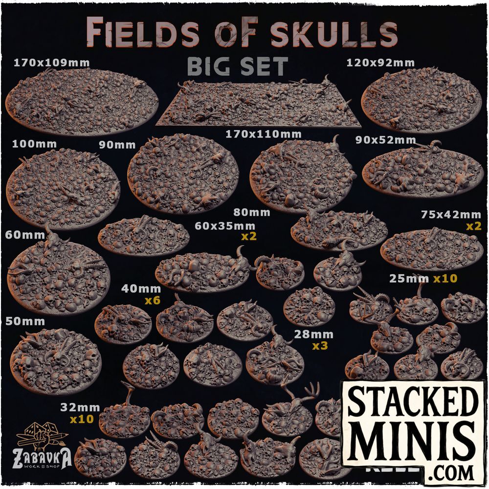 Scenic terrain bases from the Fields of Skulls range by Zabavka Workshop. Sculpted bases in 14 sizes from 25mm to 170x109mm, designed for tabletop wargaming and display.