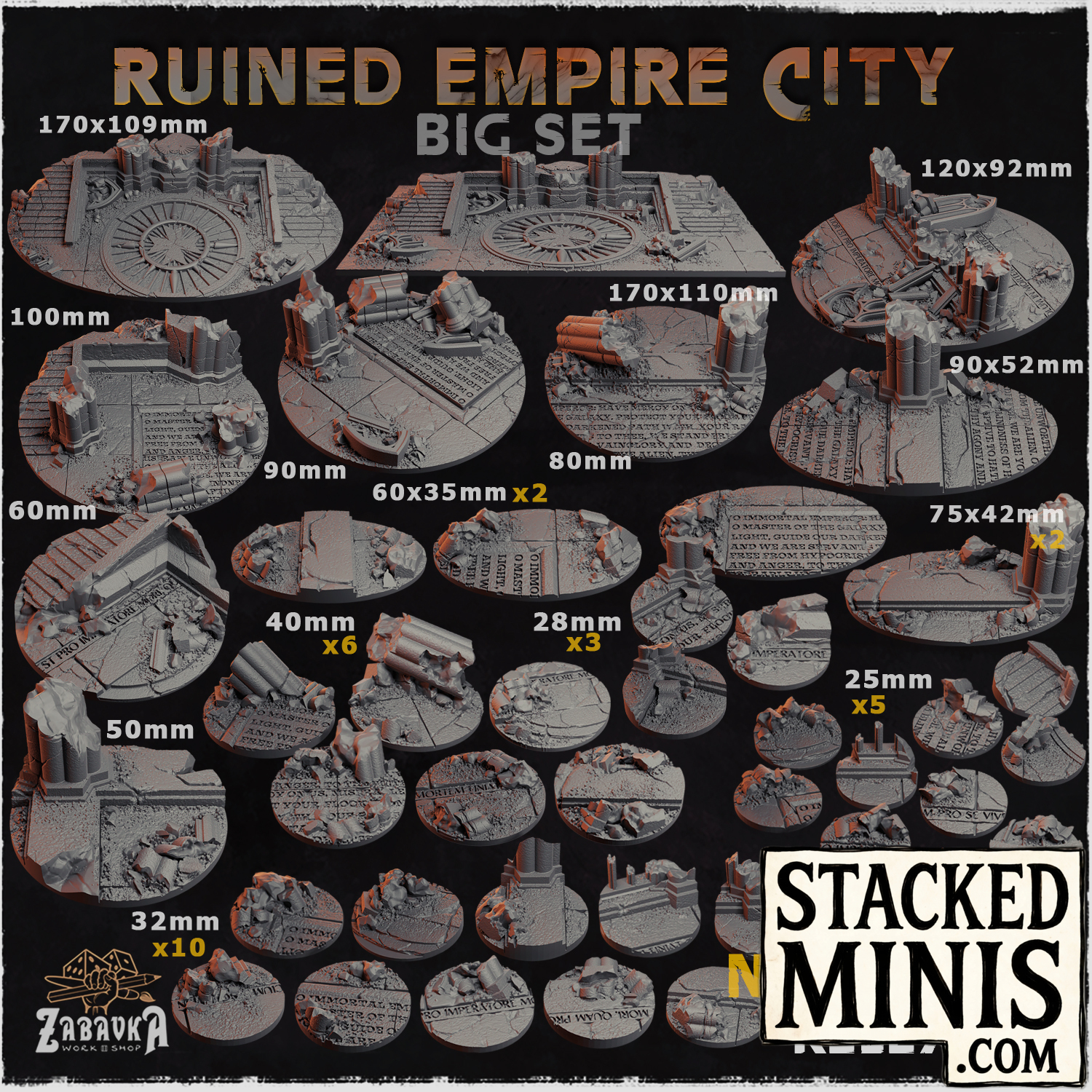 Scenic terrain bases from the Ruined Empire City range by Zabavka Workshop. Sculpted bases in 14 sizes from 25mm to 170x109mm, designed for tabletop wargaming and display.
