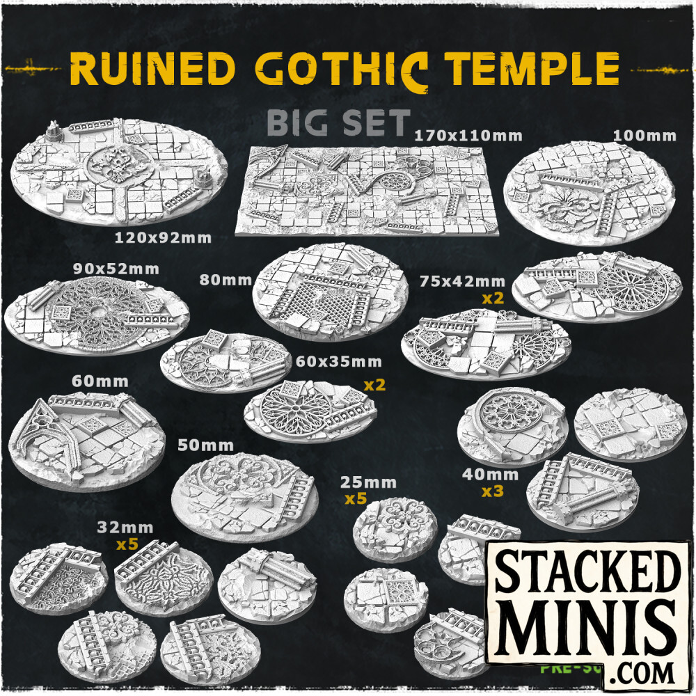 Scenic terrain bases from the Ruined Gothic Temple range by Zabavka Workshop. Sculpted bases in 12 sizes from 25mm to 170x109mm, designed for tabletop wargaming and display.