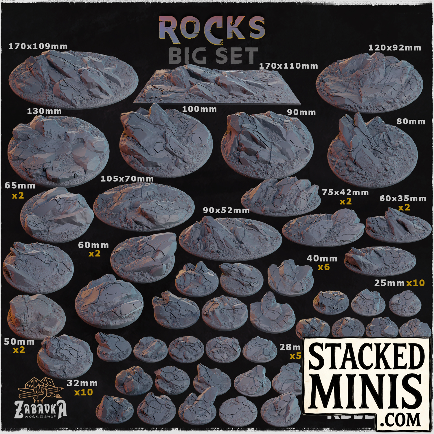 Base topper inserts from the Rocks range by Zabavka Workshop. 17 sizes from 25mm to 170x109mm, each designed to sit flush on a compatible base.