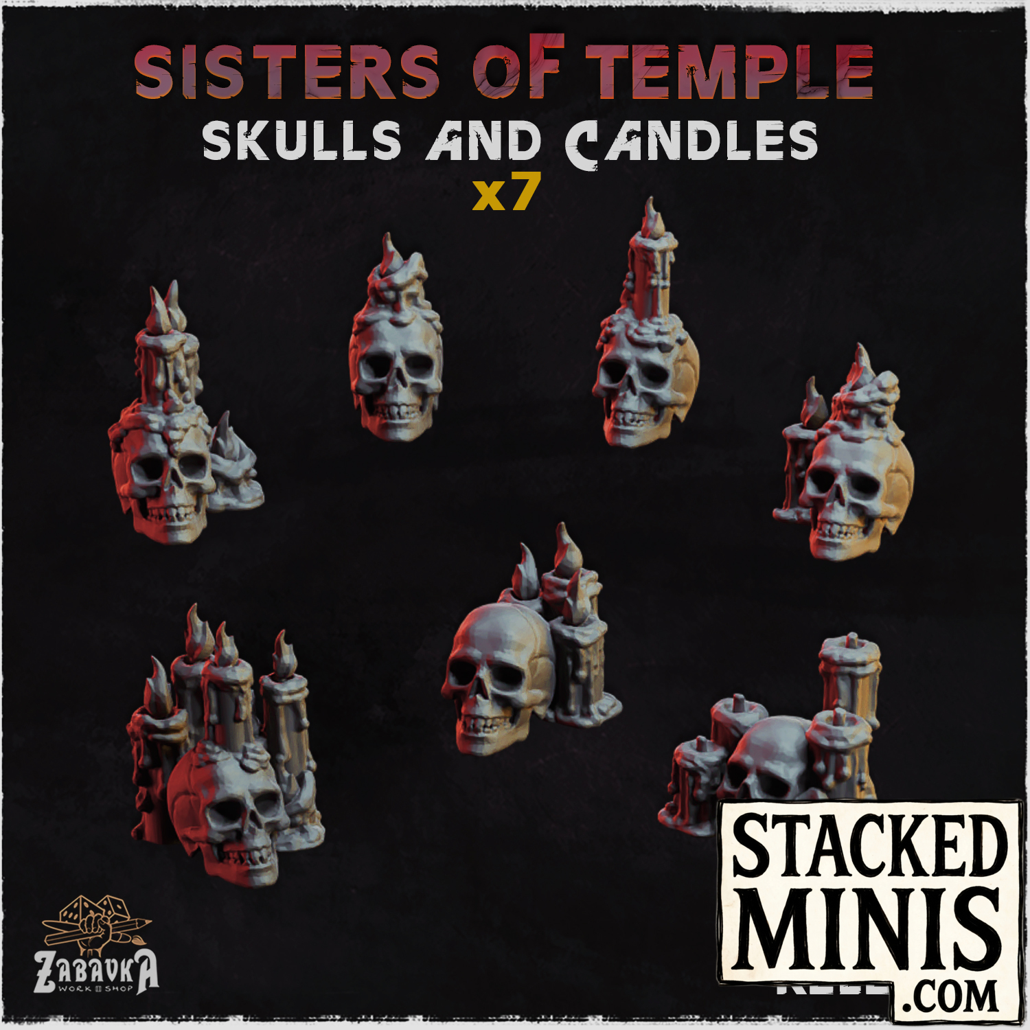 Skulls and Candles terrain pieces from the Sisters of Temple range by Zabavka Workshop. 7 unique pieces in the set, designed for tabletop terrain and basing.