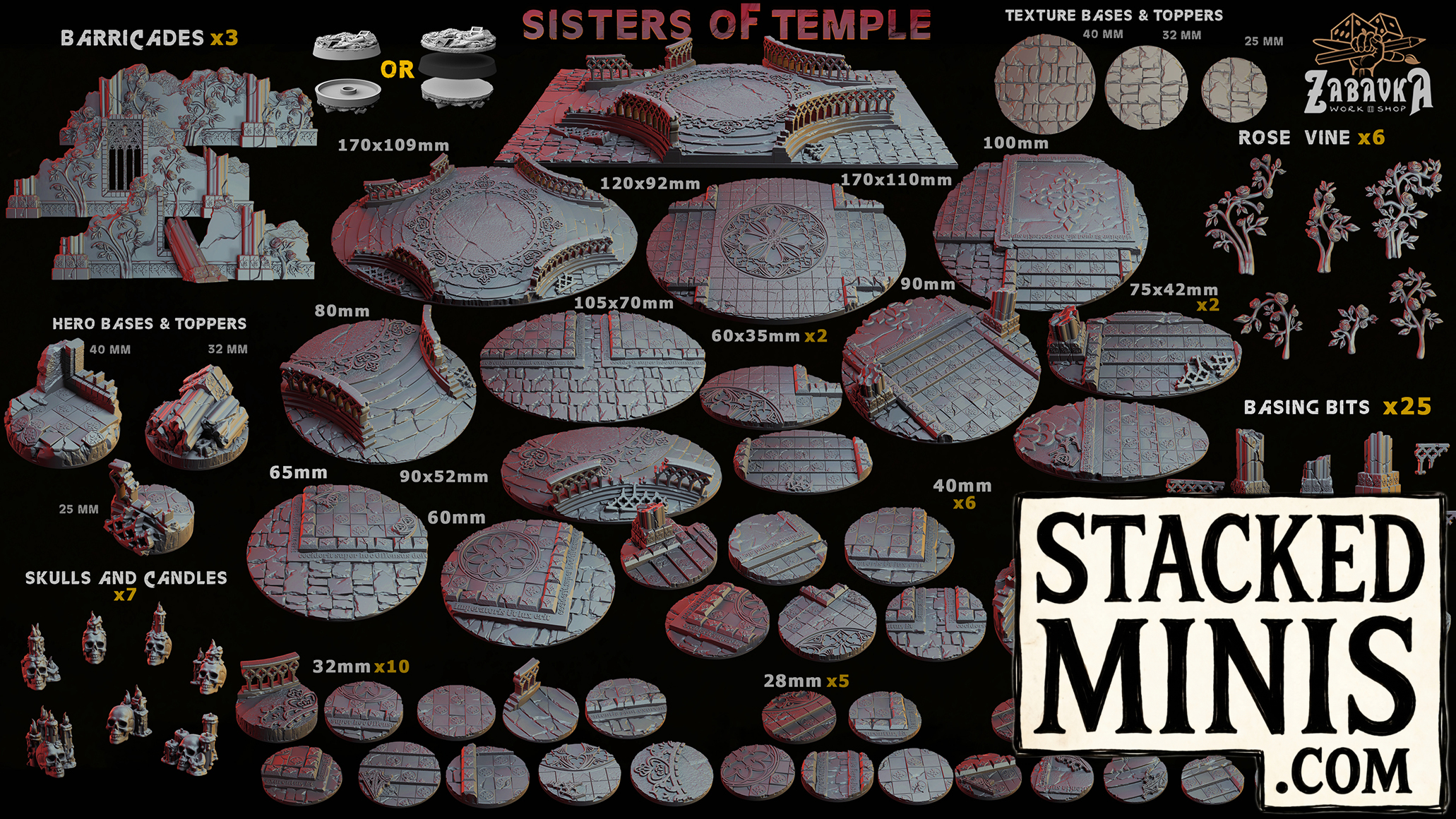 Base topper inserts from the Sisters of Temple range by Zabavka Workshop. 16 sizes from 25mm to 170x109mm, each designed to sit flush on a compatible base.