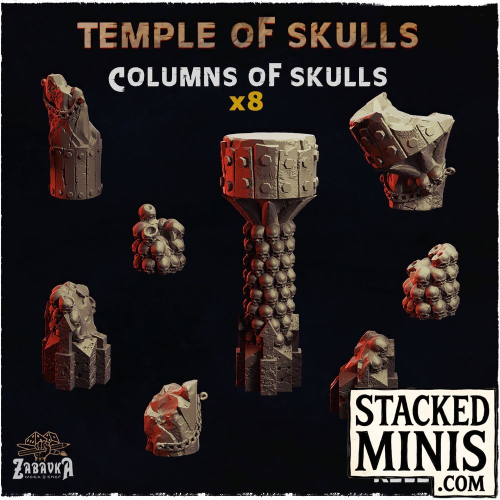 Columns of Skulls terrain pieces from the Temple of Skulls range by Zabavka Workshop. 8 unique pieces in the set, designed for tabletop terrain and basing.